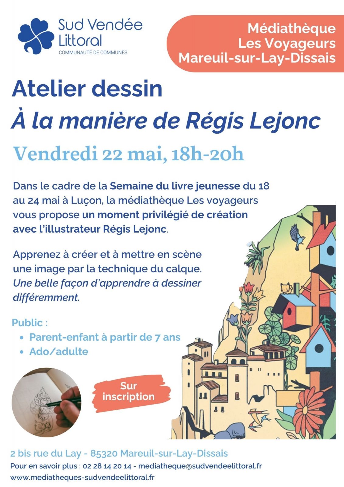 As part of the Semaine du livre jeunesse (Children's Book Week) being held in Luçon from 18 to 24 May, the Les Voyageurs multimedia library is hosting a special creative event with illustrator Régis Lejonc.