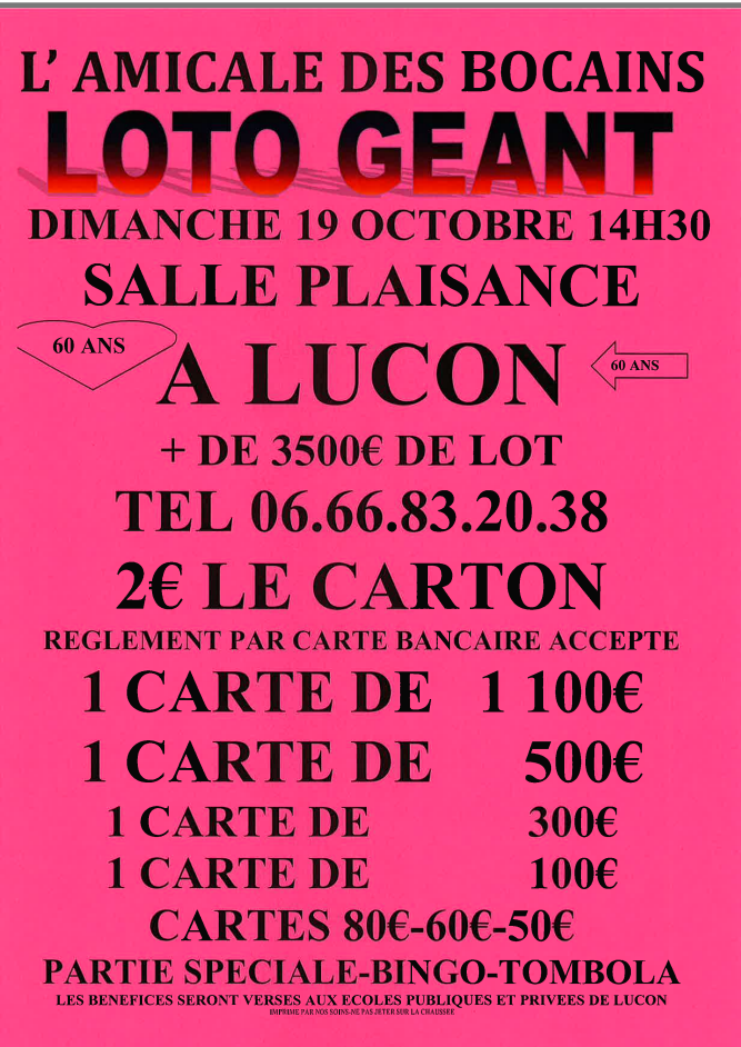 60 years of the Amicale des Bocains Luçonnais. Prizes: 1100, 500 etc. More than 3500 prizes