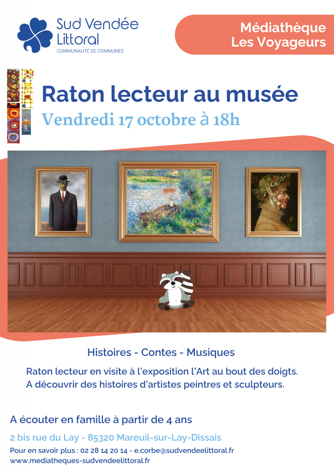 Raccoon reader visiting the Art at your Fingertips exhibition. Discover the stories of painters and sculptors.