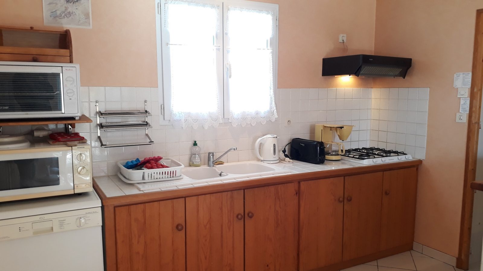 open-plan kitchen (gas cooker-electric oven-fridge/conservator) with dishwasher, living room with sitting area (television), two bedrooms each with 1 double bed (140cm), third bedroom with 2 single beds (90cm), shower room, separate WC, storeroom with washing machine leading to fourth bedroom with double bed (140cm) (television), shower room with WC. All set in an enclosed garden with sun terrace. Pets allowed