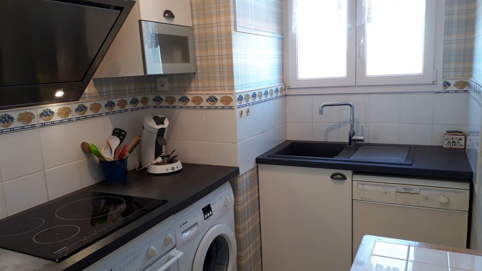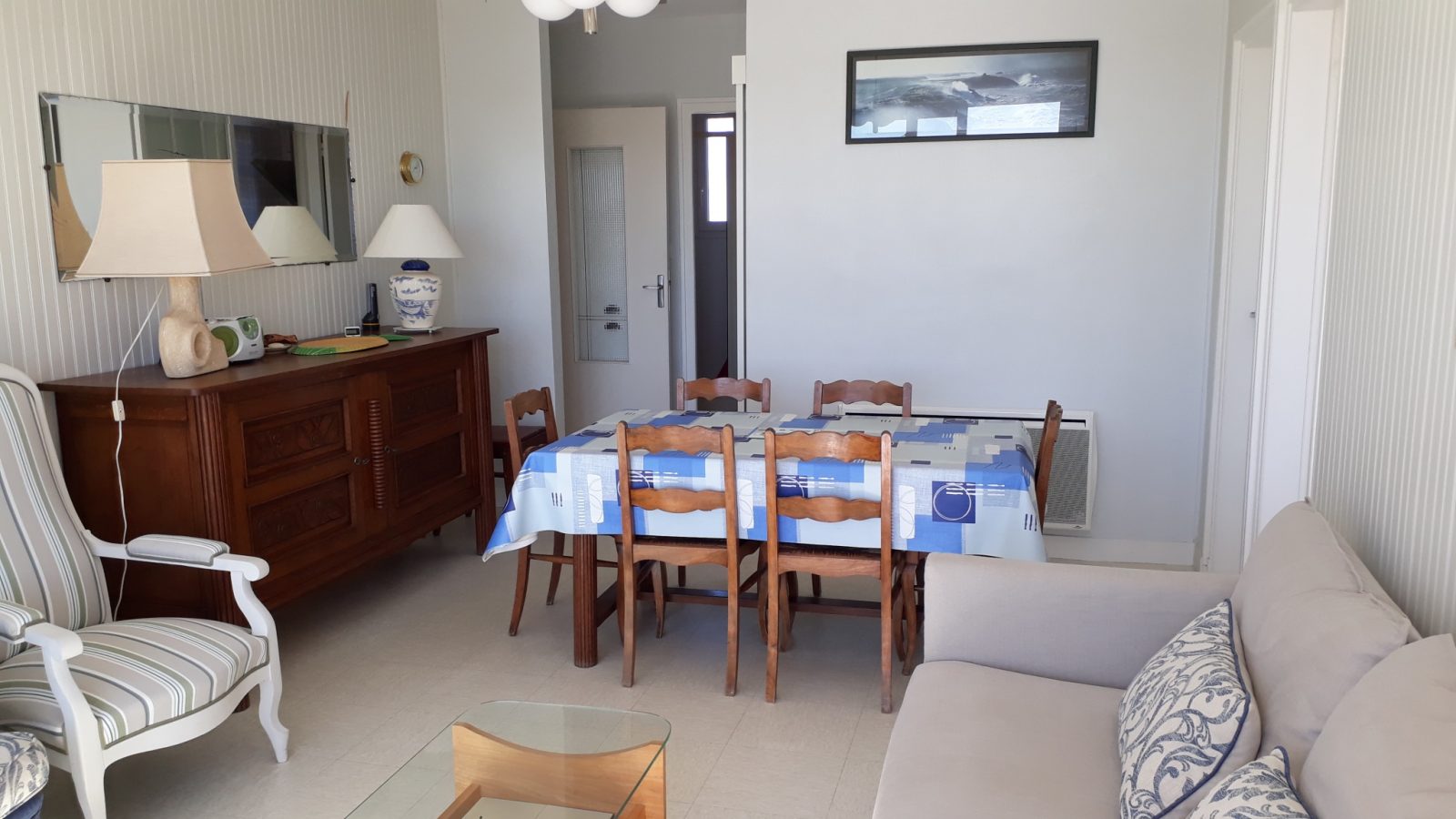 This 1st floor flat comprises an entrance hall, kitchen (induction hob, fridge-freezer, microwave) with dishwasher and washing machine, living room with television opening onto a sunny balcony, bedroom 1 with 1 double bed (140cm), bedroom 2 with 1 double bed (140cm) and 2 pull-out single beds (80cm), shower room, separate toilet (access via shower room). Parking, tennis court and bike storage for residents of the building. Pets allowed.