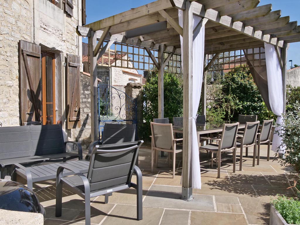 Outside, there is a terrace with a large dining table, a pergola and a barbecue.
